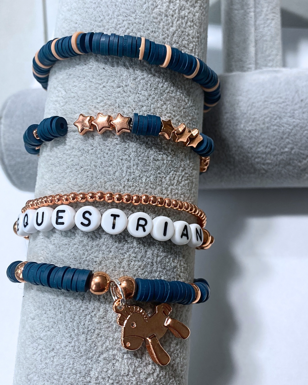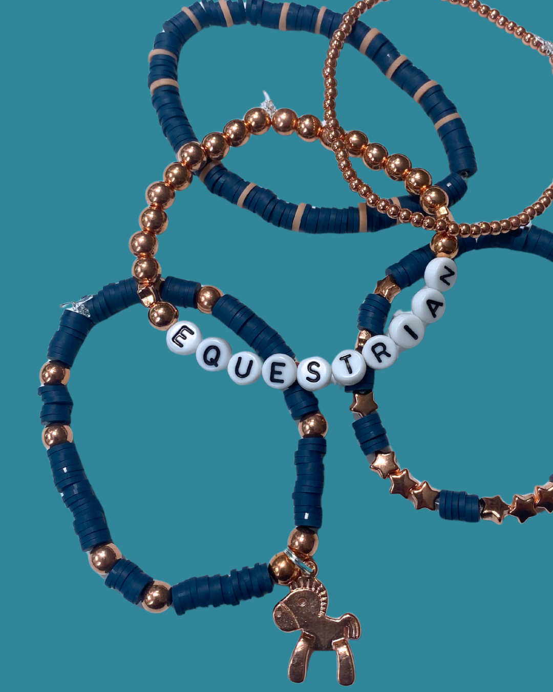 Arenas Tour Bracelet Stack Equestrian Navy/Rose GoldStack of 5 stretchy bracelets, as pictured